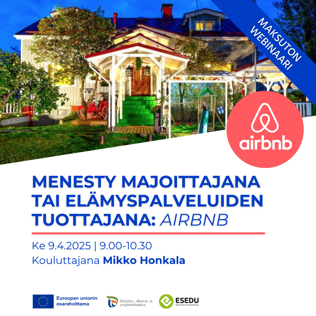 Harkitsetko vapaan tilan, asuinhuoneiston, huvilan tai mummonmökin vuokraamista? Tai tuotatko matkailijoita kiinnostavia elämyksiä tai palveluita? Tämä maksuton webinaari tarjoaa käytännönläheisen katsauksen siihen, miten teet lyhytaikaista vuokrausta Airbnb:n kautta.