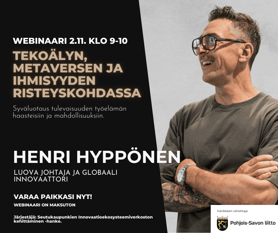 Seutukaupunkien innovaatioekosysteemiverkoston kehittäminen -hanke järjestää 2.11. klo. 9:00-10:00 Tekoälyn, metaversen ja ihmisyyden risteyskohdassa – Syväluotaus tulevaisuuden työelämän haasteisiin ja mahdollisuuksiin -webinaarin, jossa puhujana on Henri Hyppönen.