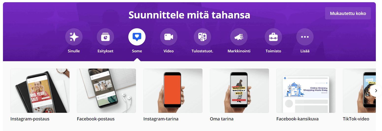 Kun haluat suunnitella uuden postauksen sosiaaliseen mediaan, diakuvan esitelmään tai vaikkapa käyntikortin, Canvasta löytyy valmis pohja siihen. Kun käytät valmiita kuvatyyppien pohjia, sinun ei tarvitse huolehtia, minkä kokoiset ja muotoiset kuvat sopivat mihinkin media-alustaan. Kuvapohjan kokoa pystyy myös muuttamaan myöhemmin. Jos päätätkin Facebook-postauksen sijaan käyttää kuvaa Instagramissa, voit helposti vielä vaihtaa kuvakokoa. Käyttämällä sopivaa kuvakokoa varmistat, ettei suunnittelemastasi kuvasta leikkaudu mitään pois ja kuva on laadukas.